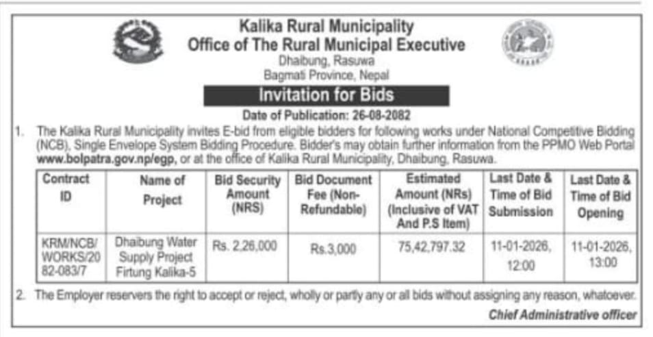 कालिका गाउँपालिकाको २०७६ चैत्र ८ गते साैर्य दैनिकमा प्रकाशित ठेक्का सम्बन्धि सूचना