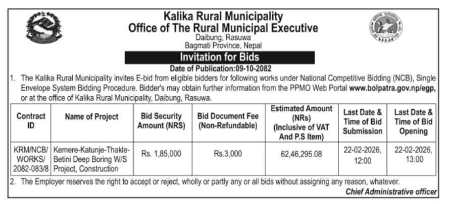 कालिका गाउँपालिकाको २०७६ चैत्र ८ गते साैर्य दैनिकमा प्रकाशित ठेक्का सम्बन्धि सूचना